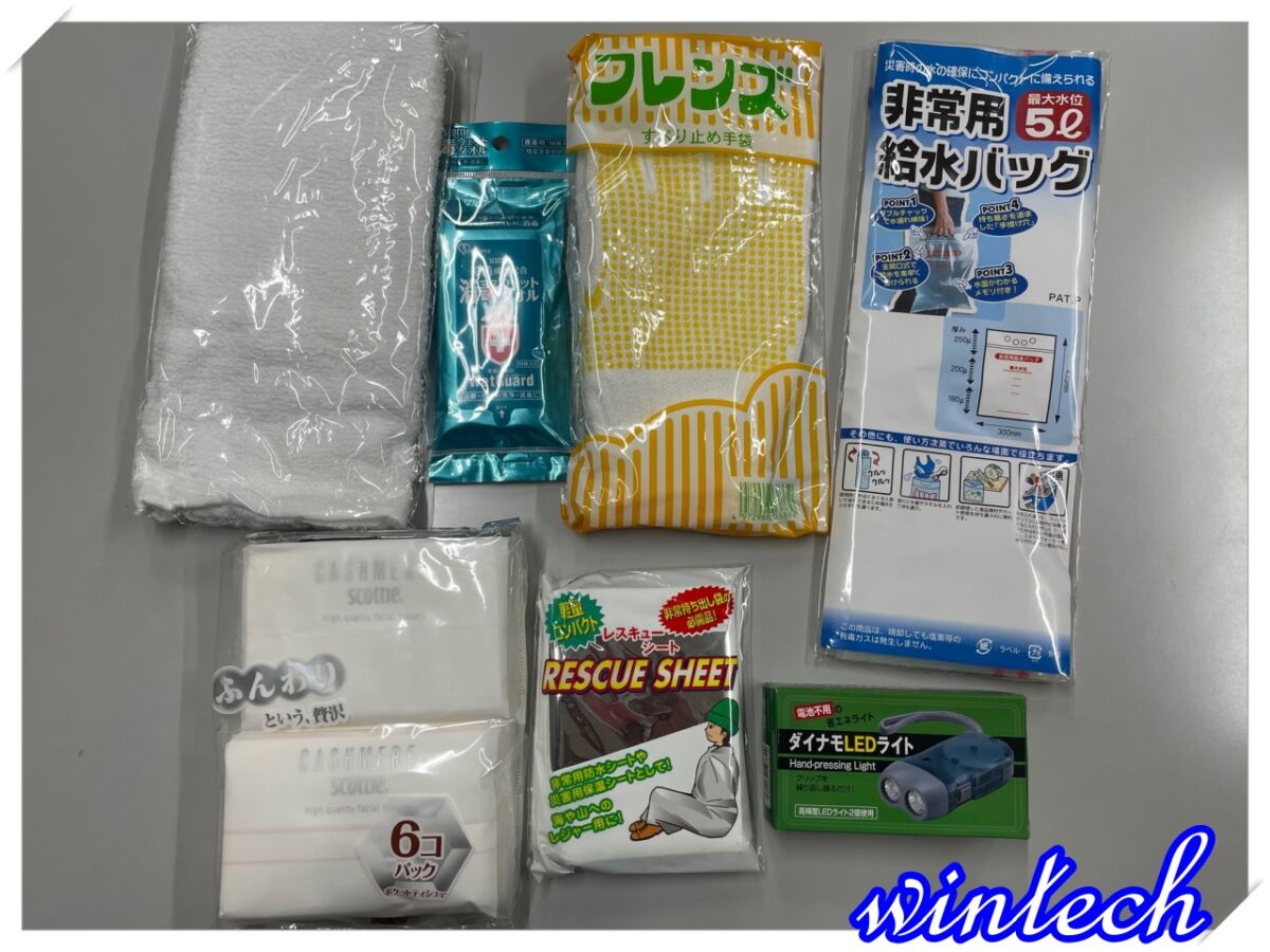 中には、タオル、手袋、ウエットタオル、給水バッグ、アルミシート、LEDライト、ティッシュが入っています。