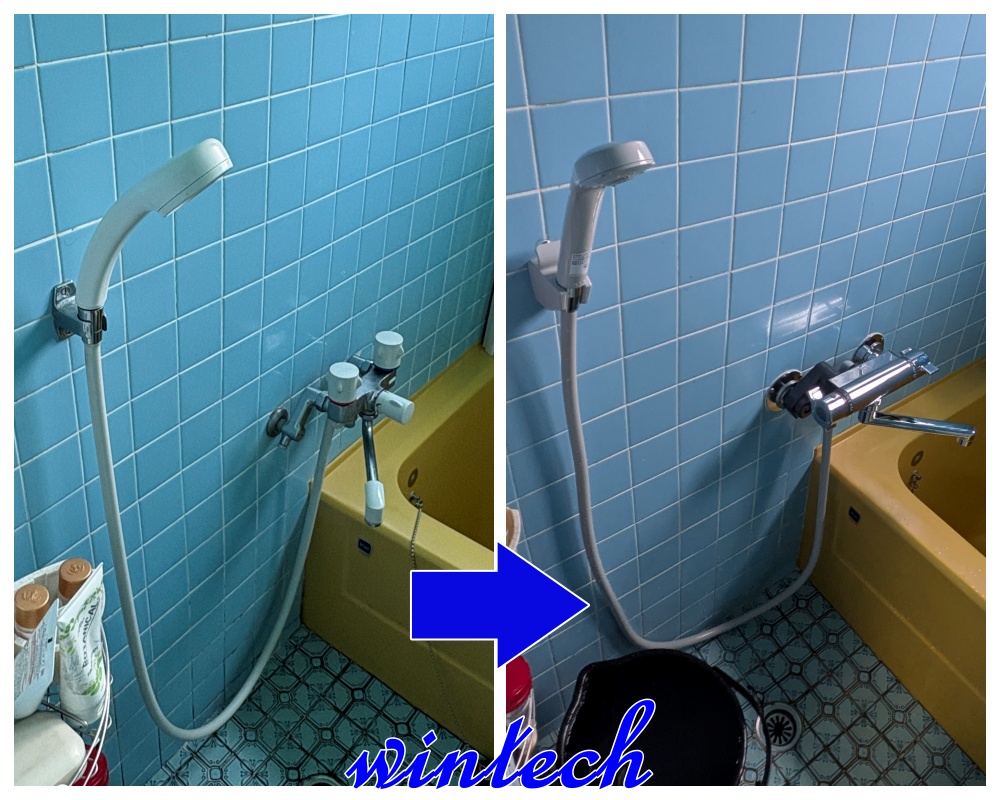 お風呂はツーハンドルのシャワー水栓から、サーモスタット付きシングルレバーシャワー水栓に交換しました。